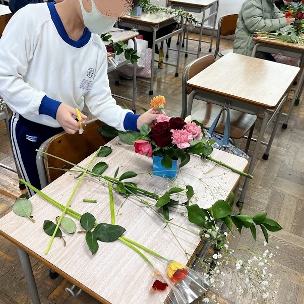 おうちの人の喜ぶ顔を思い浮かべながら、1本1本丁寧に配置や角度を工夫して花と向き合いました。