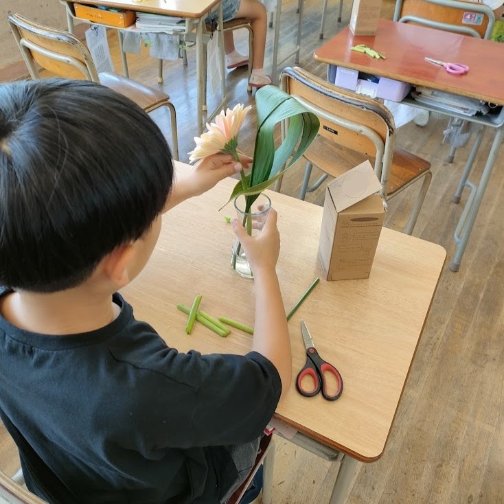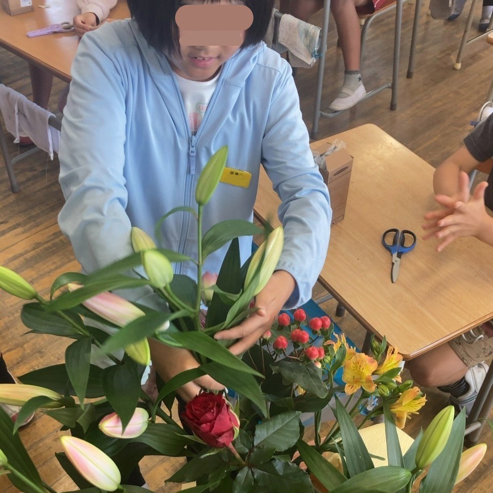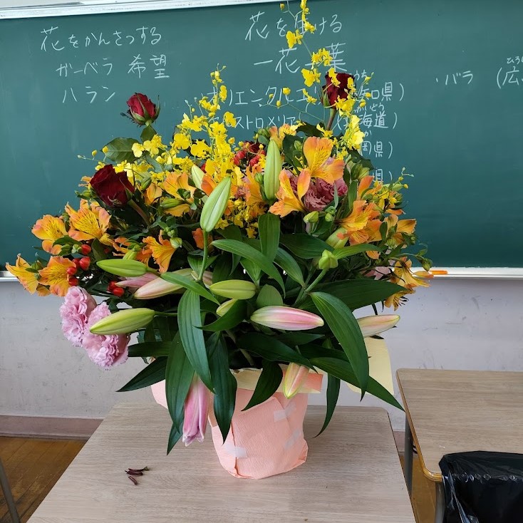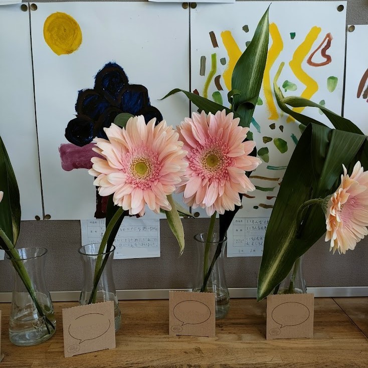 クラスの生け花に参加していただいて、クラスのみんなと同じように希望の言葉を発表して生けていただきました。保護者の方々の愛情を感じた時間でした。完成した生け花もとても素敵です。
