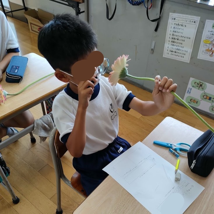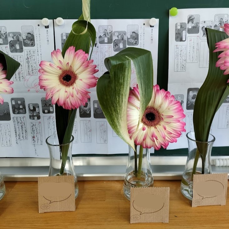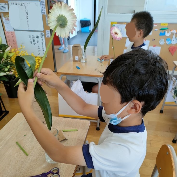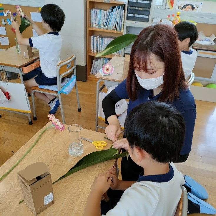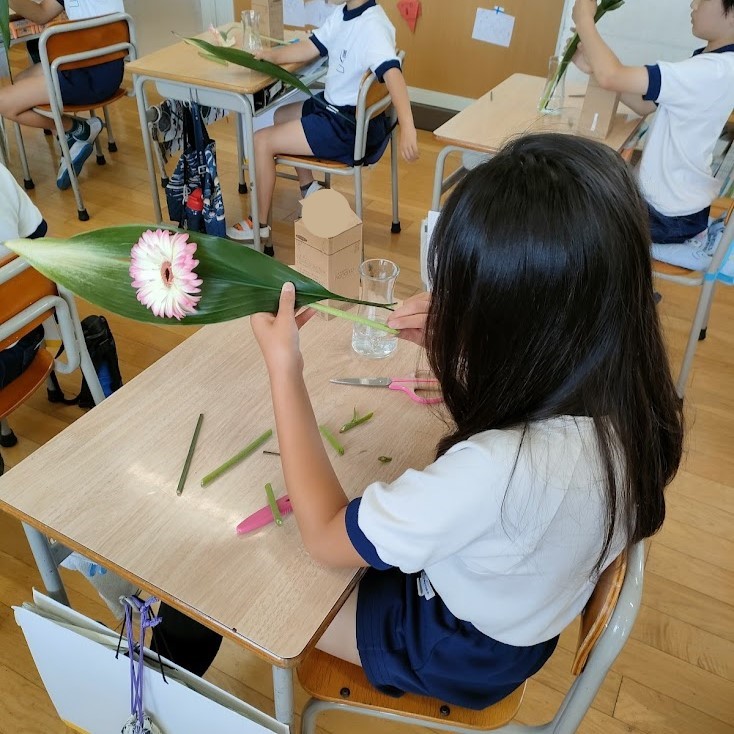 オープンスクールで参観の保護者の方達が見守る中、じっくりと花の観察を行い、ガーベラとハランを仲良く花瓶に生けました。