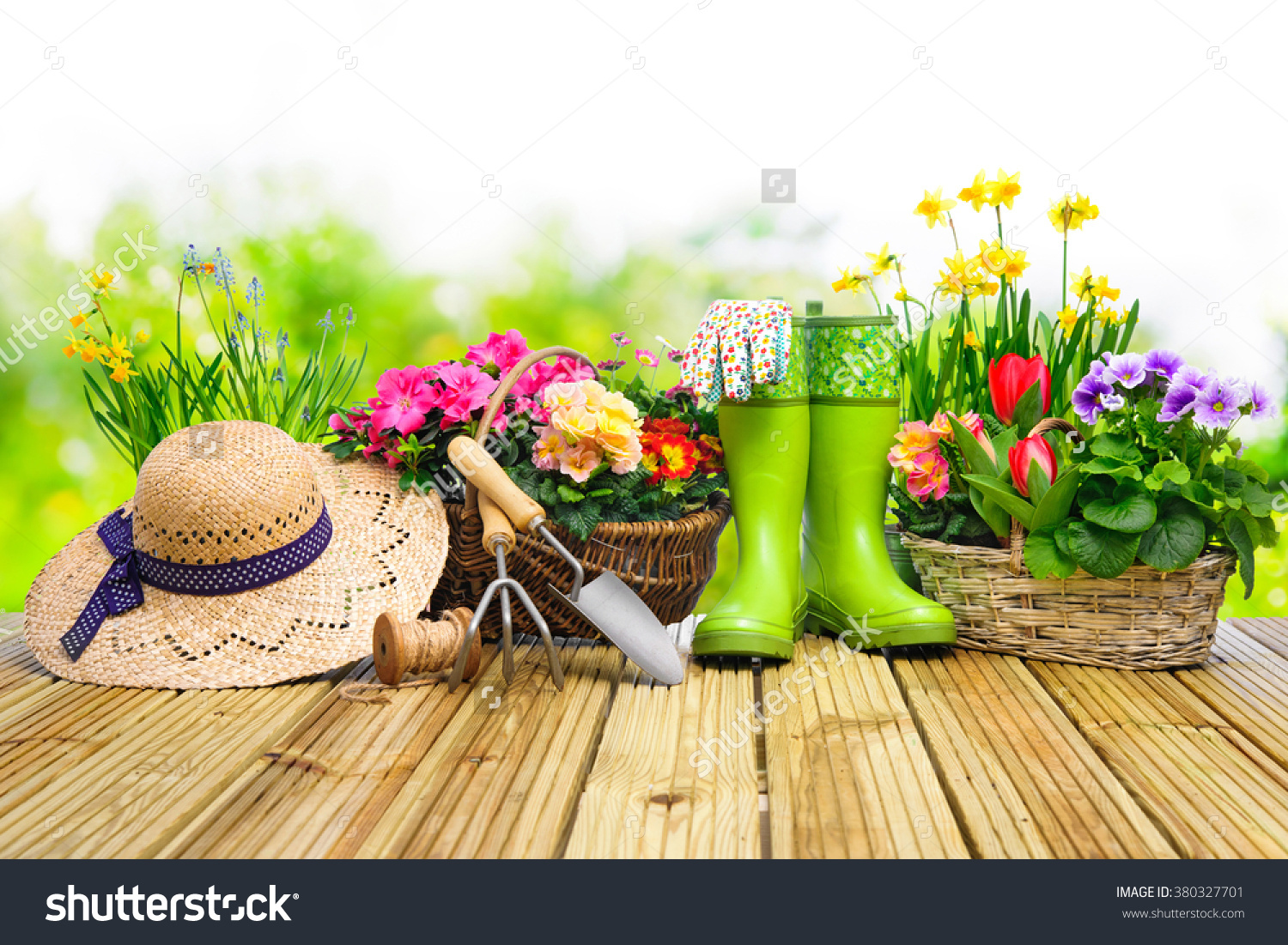 stock-photo-gardening-tools-and-flowers-on-the-terrace-in-the-garden-380327701